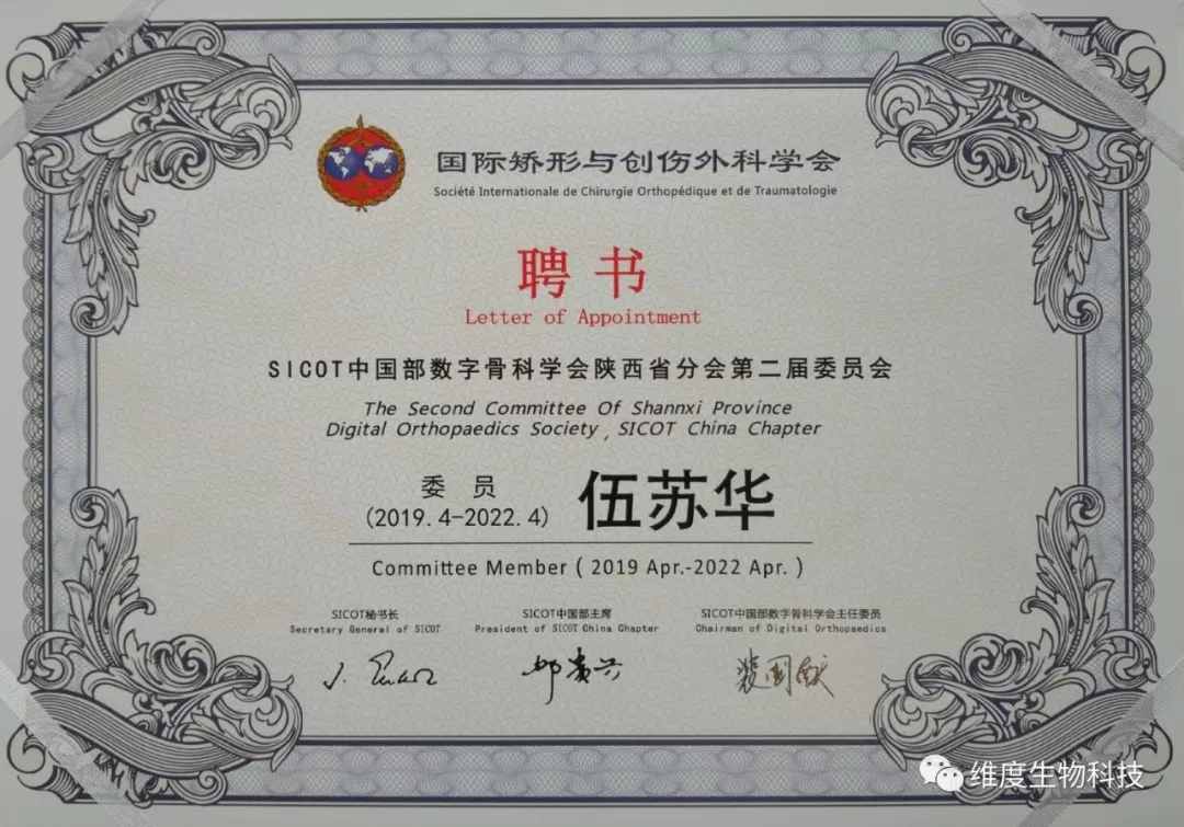 國(guó)際矯形與創(chuàng)傷外科學(xué)會(huì)(SICOT)是世界骨科與創(chuàng)傷外科領(lǐng)域最具權(quán)威的國(guó)際性學(xué)術(shù)組織之一,于1929年在法國(guó)巴黎成立,現(xiàn)總部位于比利時(shí)布魯塞爾,會(huì)員遍及110個(gè)國(guó)家和地區(qū)。2011年,SICOT中國(guó)部成立,開啟了SICOT在中國(guó)的新紀(jì)元。SICOT中國(guó)部專注于推動(dòng)骨與創(chuàng)傷科學(xué)的進(jìn)步,提升患者的護(hù)理水平,發(fā)展教學(xué)、研究與教育,促進(jìn)和鼓勵(lì)成員間專業(yè)經(jīng)驗(yàn)的交流。維度核心成員再次當(dāng)選該學(xué)術(shù)組織的重要職務(wù),必將有力的推動(dòng)數(shù)字骨科的發(fā)展。