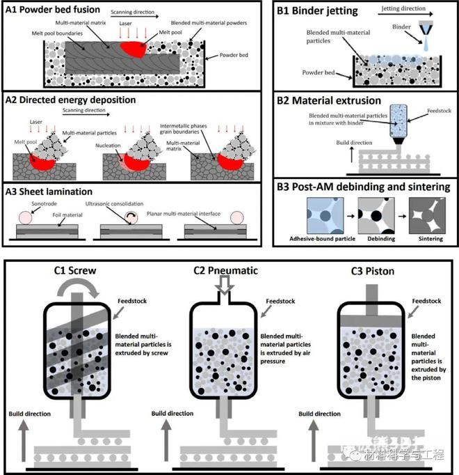 圖1 (A)激光增材制造(B) 粘結(jié)劑噴射增材制造(C)三種多材料擠壓增材制造技術(shù)