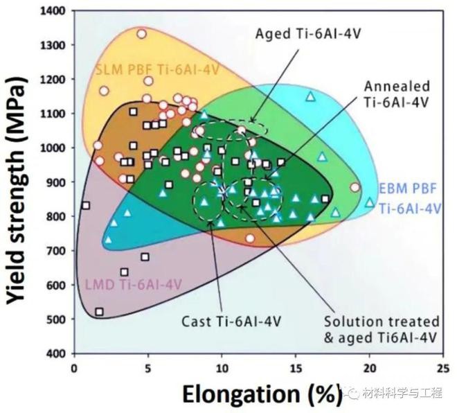 圖2 增材制造和常規(guī)方法制備的Ti6Al4V的屈服強(qiáng)度和塑性