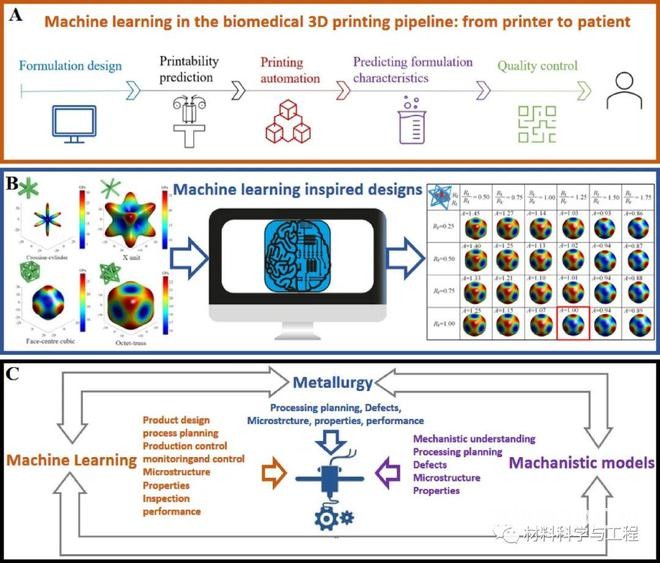 (C)冶金學(xué)、機(jī)械建模和機(jī)器學(xué)習(xí)在金屬3D打印各個(gè)具體過(guò)程中的貢獻(xiàn)。