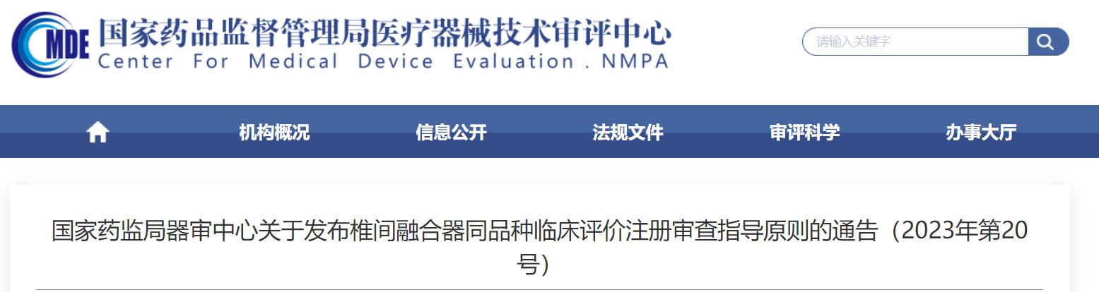 國家藥監(jiān)局器審中心關(guān)于發(fā)布椎間融合器同品種臨床評價注冊審查指導(dǎo)原則的通告(2023年第20號)