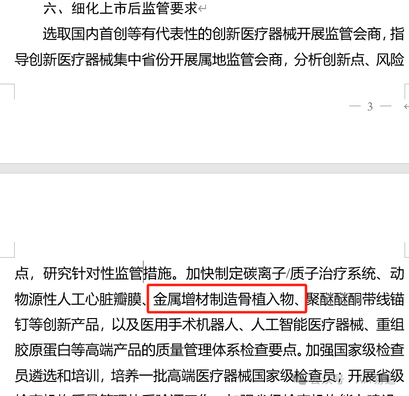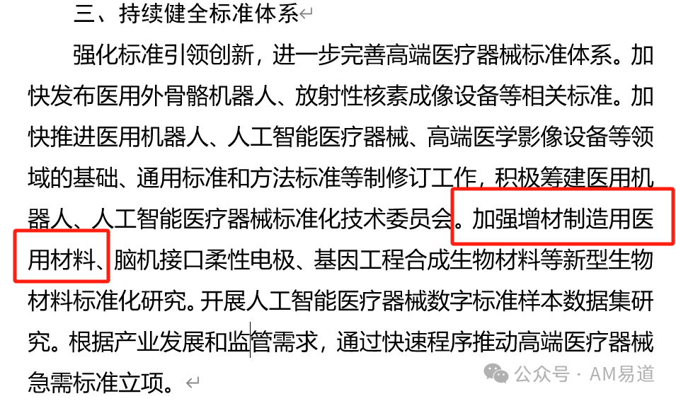 意見稿特別提出"加強(qiáng)增材制造用醫(yī)用材料"標(biāo)準(zhǔn)化研究,并將在上市后監(jiān)管環(huán)節(jié)加快制定"