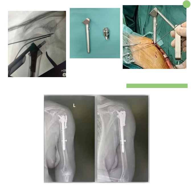 在與家屬和老人的充分溝通后,決定實(shí)施該手術(shù)。為了進(jìn)一步減少創(chuàng)傷,避免過多剝離顯露,術(shù)中采用經(jīng)三角肌外側(cè)入路、利用撐開器和翹剝復(fù)位,結(jié)合輔助置釘裝置,向肱骨近端置入髓內(nèi)主釘。近端金屬骨小梁+微多孔結(jié)構(gòu)的幾何形狀體,為肱骨頭提供直接髓內(nèi)支撐,有效復(fù)位并矯正肱骨頭翻轉(zhuǎn)嵌插,再由髓外接骨板向肱骨頭內(nèi)置入空心拉力釘和4枚定制鎖釘,縫合周圍肩袖韌帶。手術(shù)全程歷時(shí)40分鐘,經(jīng)過術(shù)中透視證實(shí),骨折區(qū)域達(dá)到精確復(fù)位和穩(wěn)定固定效果。